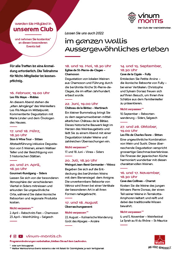 Unsere Events sind ebenso zahlreich wie vielfältig. Bei diesen Veranstaltungen können Sie das ganze Jahr über Weine...Vinum Montis News